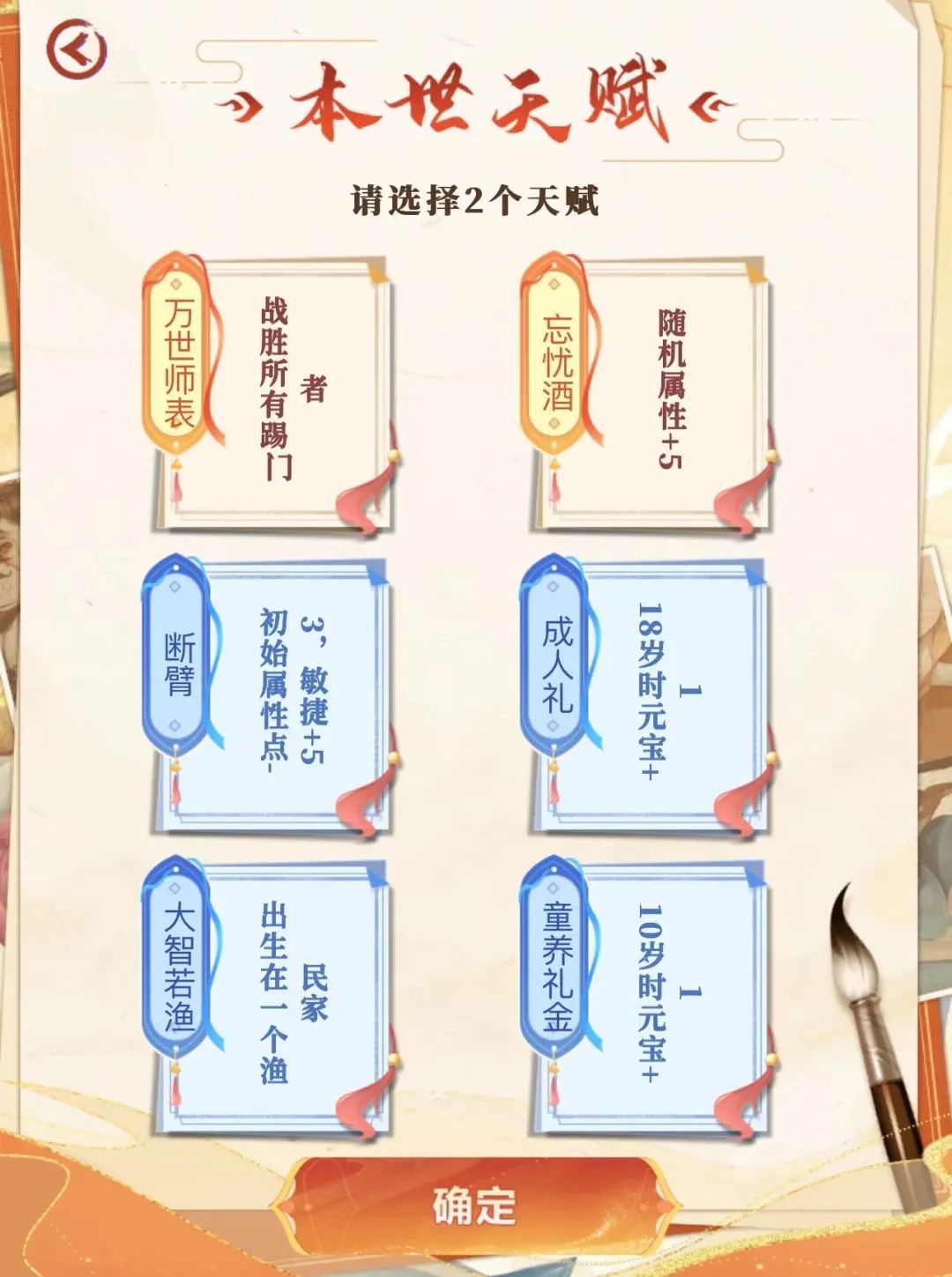 在【江湖重开】模拟器中,少侠每次进入都可以选择个人天赋和人物属性加点进行“重生”。
