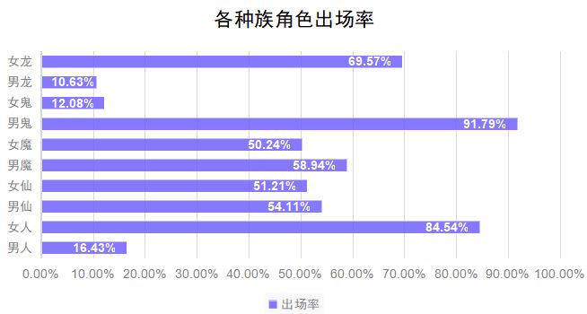 可以看出,仙族高达95%的出场率几乎是各队伍必带角色,男鬼的出场率也高达90%以上,常规比赛中很少见到的女人在无差别挑战赛中也成为了重要角色之一,可以控血、可以输出、可以站桩、可以控制,实打实的万金油角色。