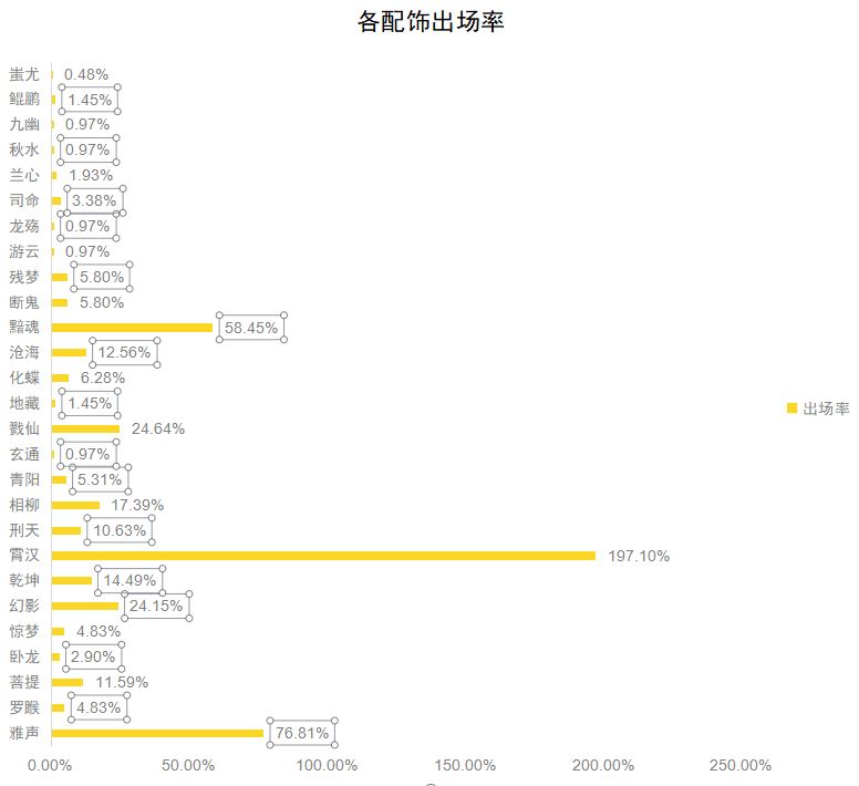 霄汉配饰在场均出场两次的成绩傲然登顶,雅声提供的抗性和黯魂的控血功能分获二三名。