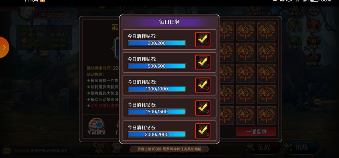 这个每日任务是消耗2000钻石,领取10张卡,那么塔罗牌就不需要你刻意的去买,你完全可以在做日常活动的时候花两千钻石出去攒卡,基本上每日快速战斗三次花三百钻石,买一次精灵神殿150钻石,抽宠物十连1000钻石,再零零散散有宝箱买几个,基本上任务就做完了,也保证了收益最大化