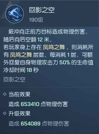 【回影之空】虽然造成的伤害不高,但却是一个位移兼回血技能,在满层凤鸣之舞的状态下,能够恢复的血量就要看大家的物理攻击力有多少了。