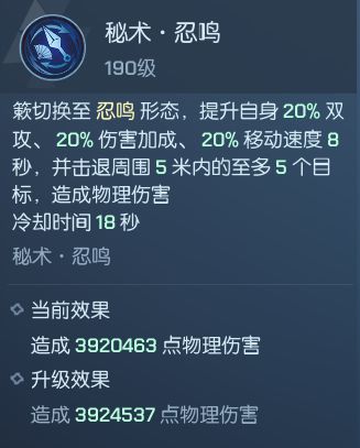 【秘术·忍鸣】是从扇舞形态切换到忍鸣形态的切换技能,施展后能获得8秒的20%双攻和20%增伤,需要注意的是,忍印的真实伤害并不受到伤害加成影响,在使用技能时,需要注意计算伤害量。