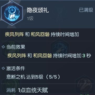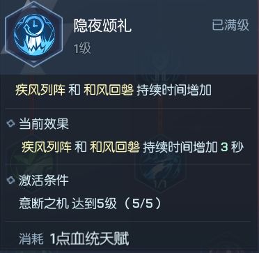 作为能够为【疾风列阵】和【和风回磬】两项技能提供增益的存在,这项血统天赋是近战流派必须点亮的,远程流派则可以根据自身情况,考虑是否需要点亮。