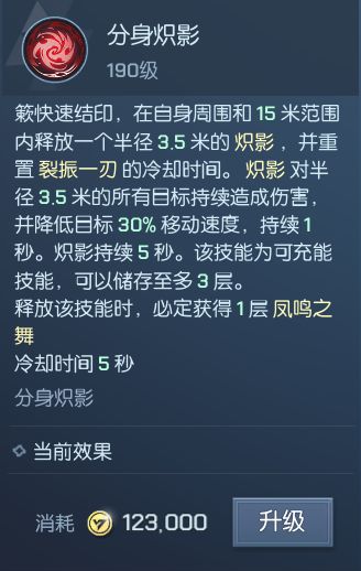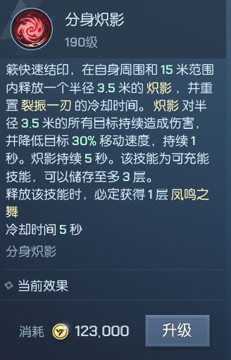 【分身炽影】是个可充能的技能,冷却时间短,能重置裂振一刃冷却时间,还可以叠加被动层数,在给范围内目标造成伤害的同时,还能降低目标移速。另外,这个技能施展之后,还能获得一层【凤鸣之舞】的被动效果。