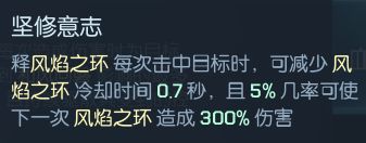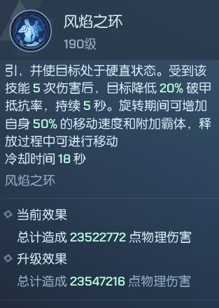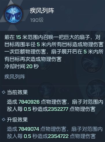 【疾风列阵】是一个伤害十分可观的范围技能,而且造成的还是持续性伤害,总伤害接近1.5倍的风焰之环。不过20秒的冷却时间稍长,建议同学们可以尽早使用。