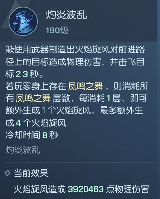 【灼炎波乱】则是控制技能,拥有击飞效果,在技能施展的同时还能消耗被动层数,额外生成的旋风会向四面八方移动,据说每多1个旋风就多1倍伤害,5个旋风就是5倍伤害,伤害十分可观。