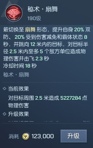 【秘术·扇舞】是一个位移+形态转换的技能,施展技能可以获得8秒的双防提升、减伤和霸体,听说还可以在沉默状态下施放,是一个很不错的冲阵技能。各位同学在实战中可以好好利用。