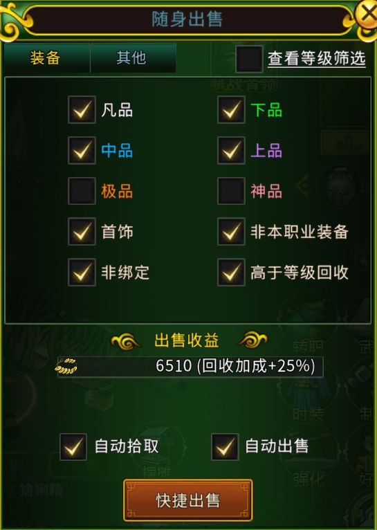 而前期好装备的获取是升级效率的保证。装备都分别为凡品、下品、中品、上品、极品以及神品,前中期我们就以上品和极品作为我们的心仪装备,大侠们选择职业对应等级的装备之后,就可以开始尝试获取心仪装备了。