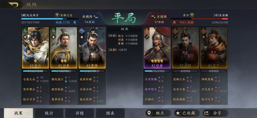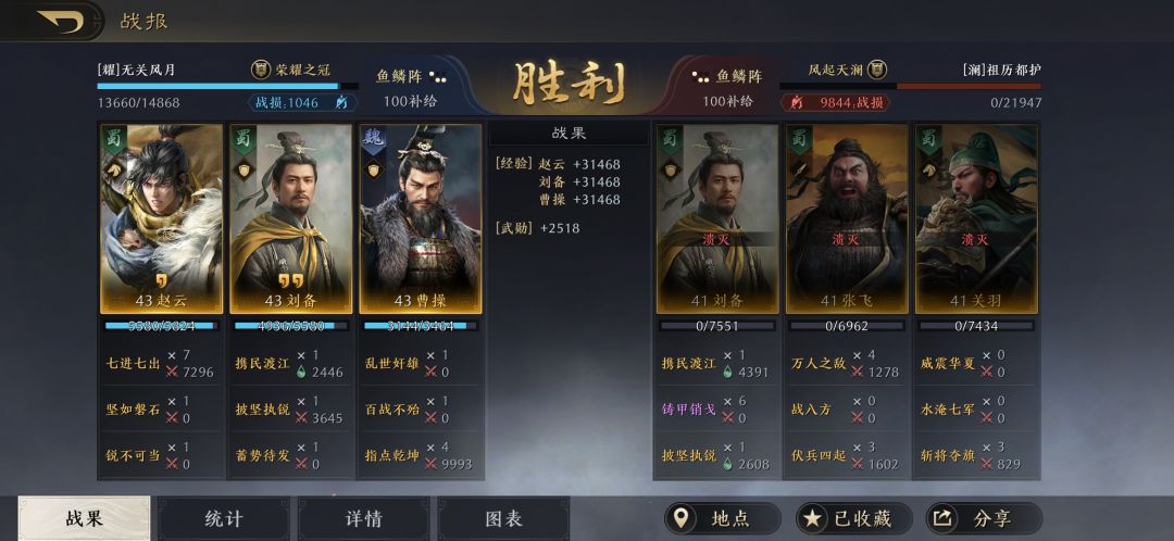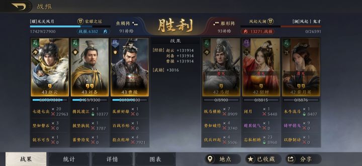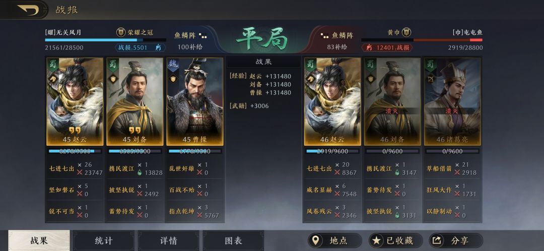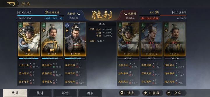 曹操和刘备是全智力加点,要保证赵云的统御和武力是最高,曹操的减伤可以保证赵云把百战不殆的武力和统御叠满,让赵云做到能抗能打。指点乾坤作为补充输出,曹操和刘备是全智力加点,也是可以打出不俗的伤害。