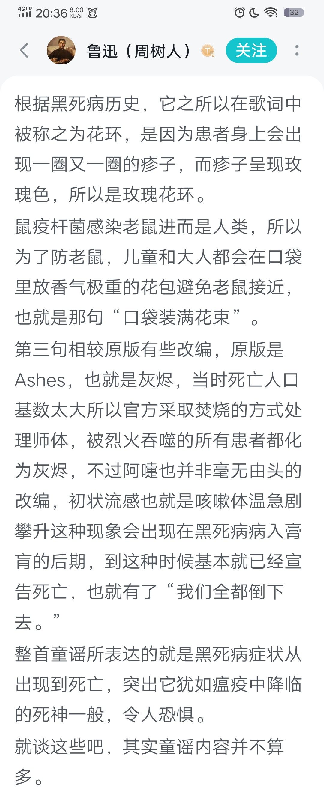 转述:“可以去看一下黑死病历史,之所以称之为花环,是因为患者身上会出现一圈又一圈的疹子,而疹子呈现玫瑰色,所以是玫瑰花环。