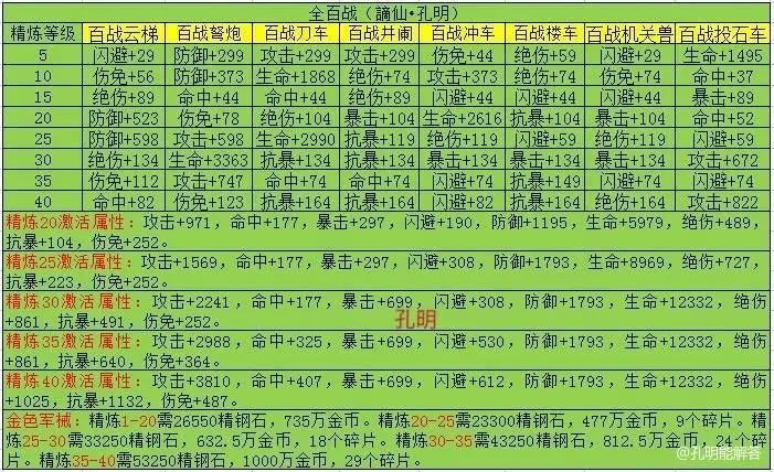 在进阶过程中也推荐加攻击力的百战军械部件优先精炼,精炼属性条带攻击出现早的优先。其中百战弩炮、百战刀车、百战井阑和百战冲车都是精炼25级前具备攻击力属性,所以普通玩家在不影响自身的战力情况下,可以优先更换。从橙色军械过渡到金色军械,对于普通玩家而言,是一个缓慢的过程,还好金色军械无需元宝精炼,那么当我们每更换一件橙色军械时,分解回收精炼所需的元宝,也是对我们努力之外的奖赏。