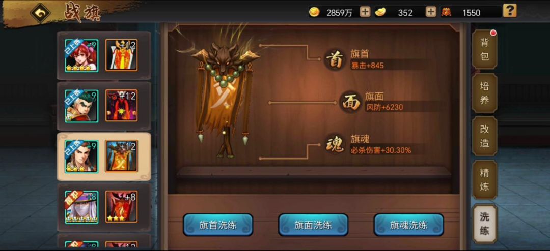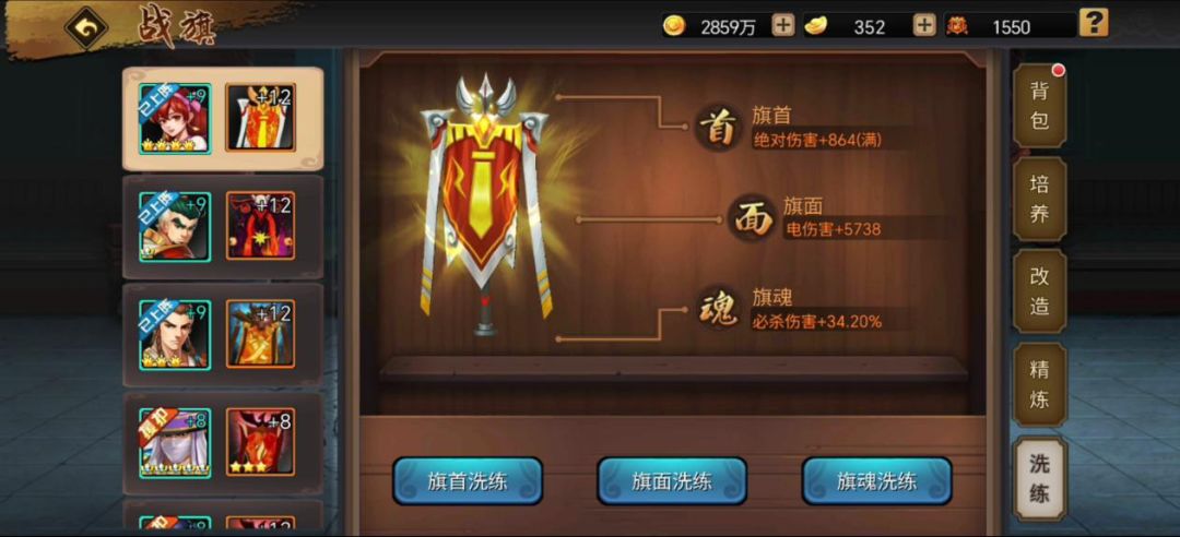 在战旗达到+3阶时,激活旗面属性,可洗练:火、冰、爆、电、风5种属性伤害或防御。当前版本气盾状态当道,建议旗面优先洗练出对应的属性伤害,然后搭配给对应技能属性的武将。