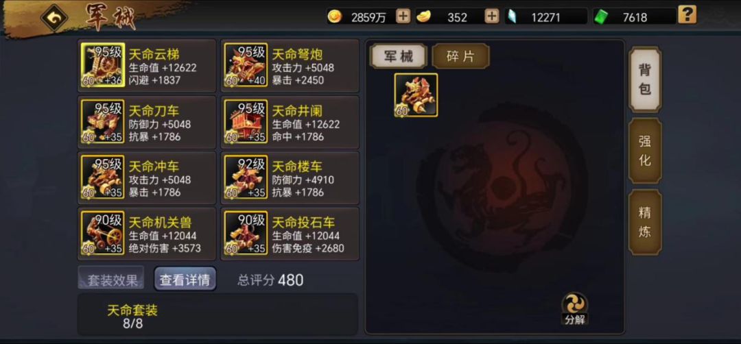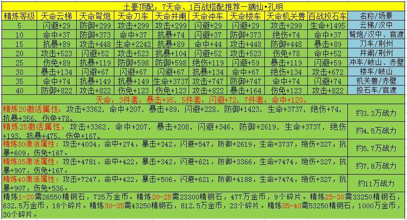 金色天命军械属性更综合全面,全套精炼30+可激活的攻击力数值要比百战套高出三分之一有多,同时还独得恩宠具备套装属性,这也是高端玩家钟爱天命军械的缘由所在。其中7天命1百战投石车是金色军械的顶级搭配,既保证了最大单位的套装属性,又兼顾了单个百战投石机产生的最大攻击力。