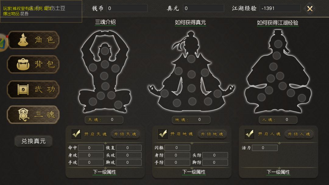 1、三魂聚鼎:天魂、地魂、人魂,分别对于角色加点属性为加命中和攻击、加防御和闪避、加人物活力。(三魂的升级需要江湖经验,江湖经验可以根据玩家打怪或者练功获取,满级武功可兑换对应的江湖经验)