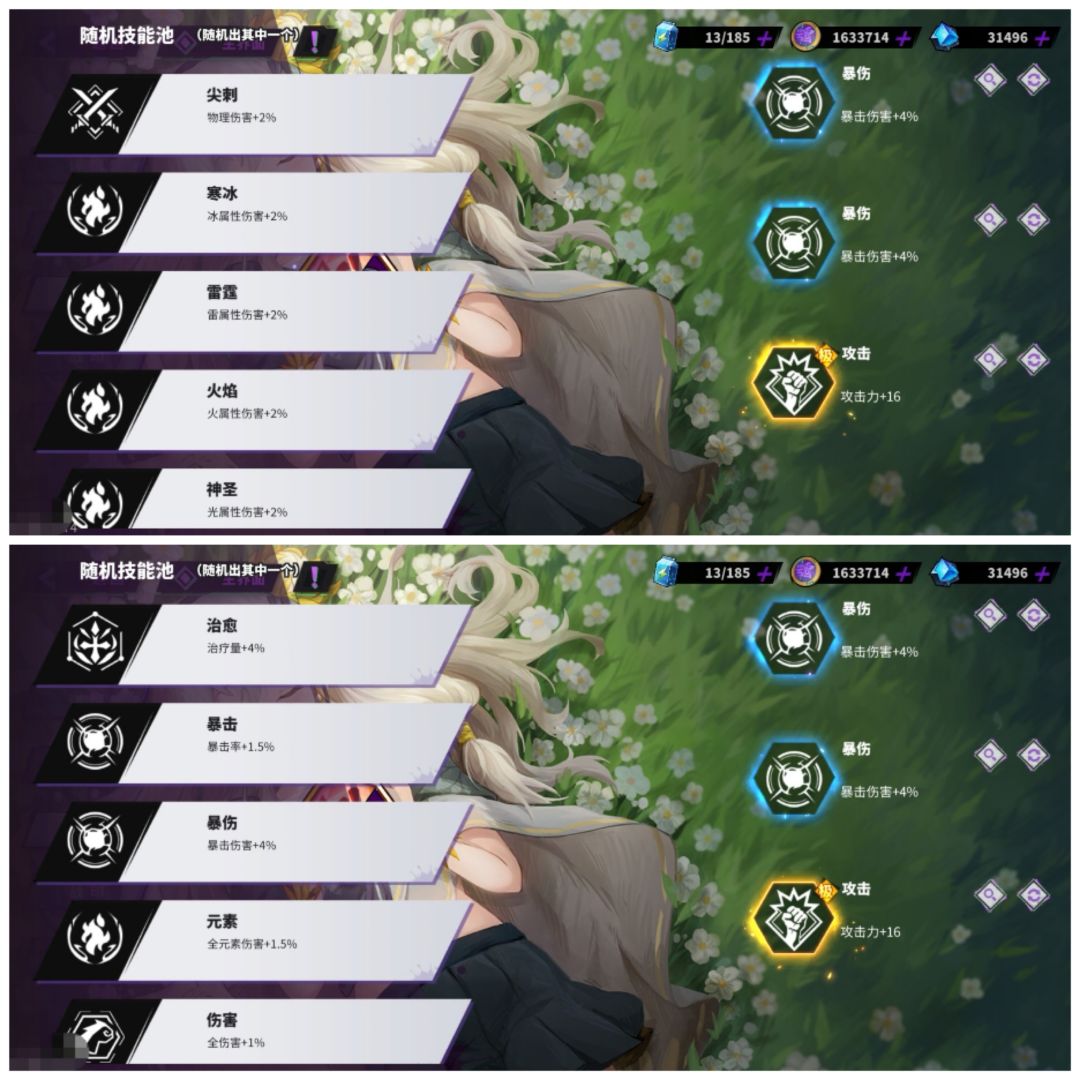 注:这种祈福类型需要注意合理搭配,尽量不要和角色的机制或属性发生冲突。比如物理角色不要选择元素类增益,孙斩天不要选择绝技能量获取等等,其中攻击类祈福(如元素伤害、全元素伤害)优先级高于防御类祈福(如受到伤害减免)。