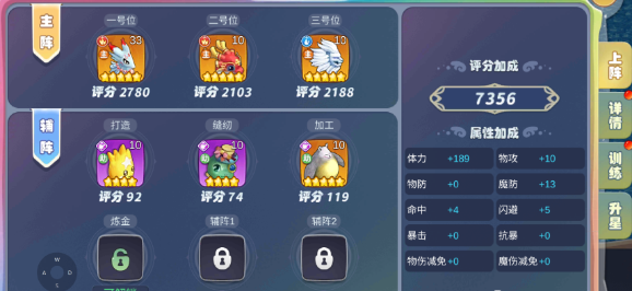 三、宠物玩法宠物系统还会有上阵,训练和升星,上阵是关于宠物是一号位,二号位或者是主阵或辅阵。主阵的宠物都可以放星数最高,评分最高的宠物,担任玩家打伤害的左右手;辅阵的宠物作用就是做一些小任务,评分要求也不高。每一个位子的解锁需要等级的提升,等级越高就可以上更多的宠物,上阵宠物可以为角色带来属性加成。