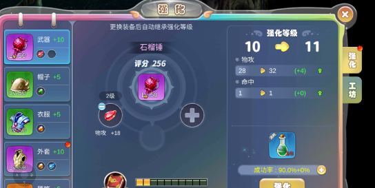1、强化玩法强化装备相信大家应该都不会陌生,强化成功后提升战力评分,如果强化失败,强化道具消息,装备无损失,强化道具是祝福油,强化等级越高祝福油用的就越多,获取途径其一是神秘岛,完成神秘岛可获取大量的祝福油,其二就是商会,商会购买用的是银币,银币还是比较好获取,击杀败野怪,创魔界,内政任务,梦玉兑换等等都是可以获取大量银币的2、工坊玩法