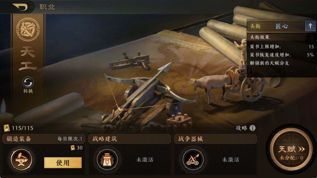 天工的三个职业天赋技能分别为:锻造装备、战略建筑和战争器械,具体如下表所示: