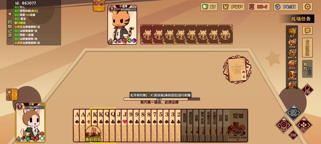 这时候如果对方能大于我方的同花,那么其对我方造成伤害,但复活甲能帮我们在18回合复活,保我方这回合不死,同时拿到19回合先手。