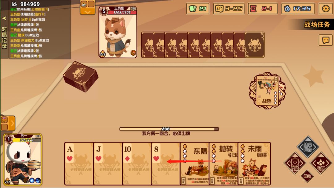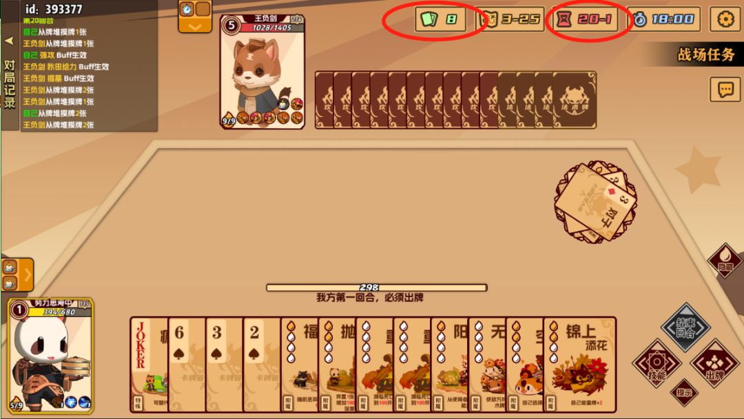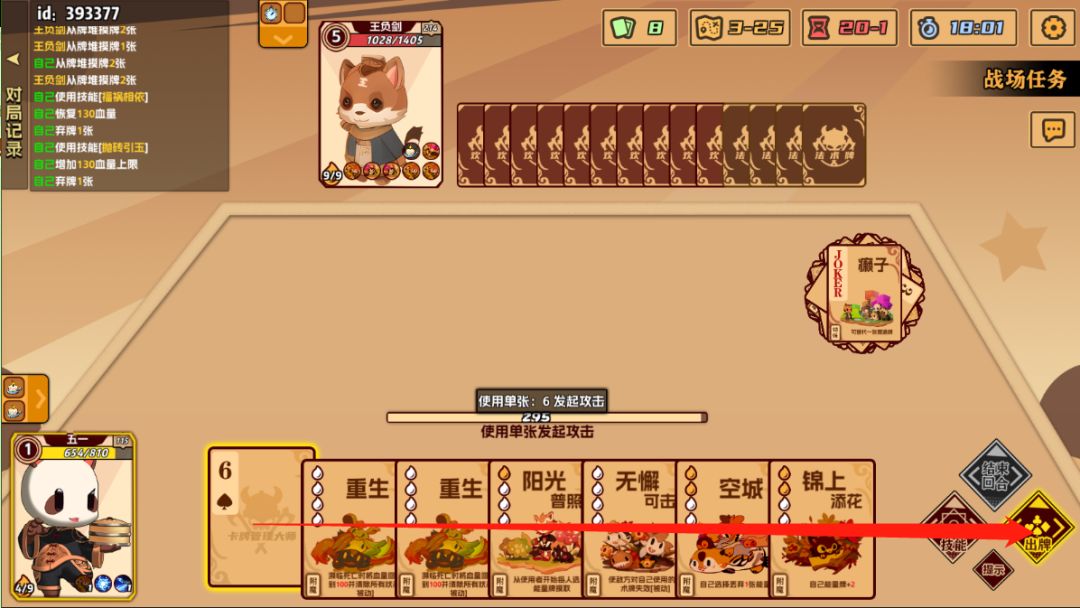 自己回合内打光手里的能量牌也就是扑克牌可对对手造成暴击(暴击伤害为%150)