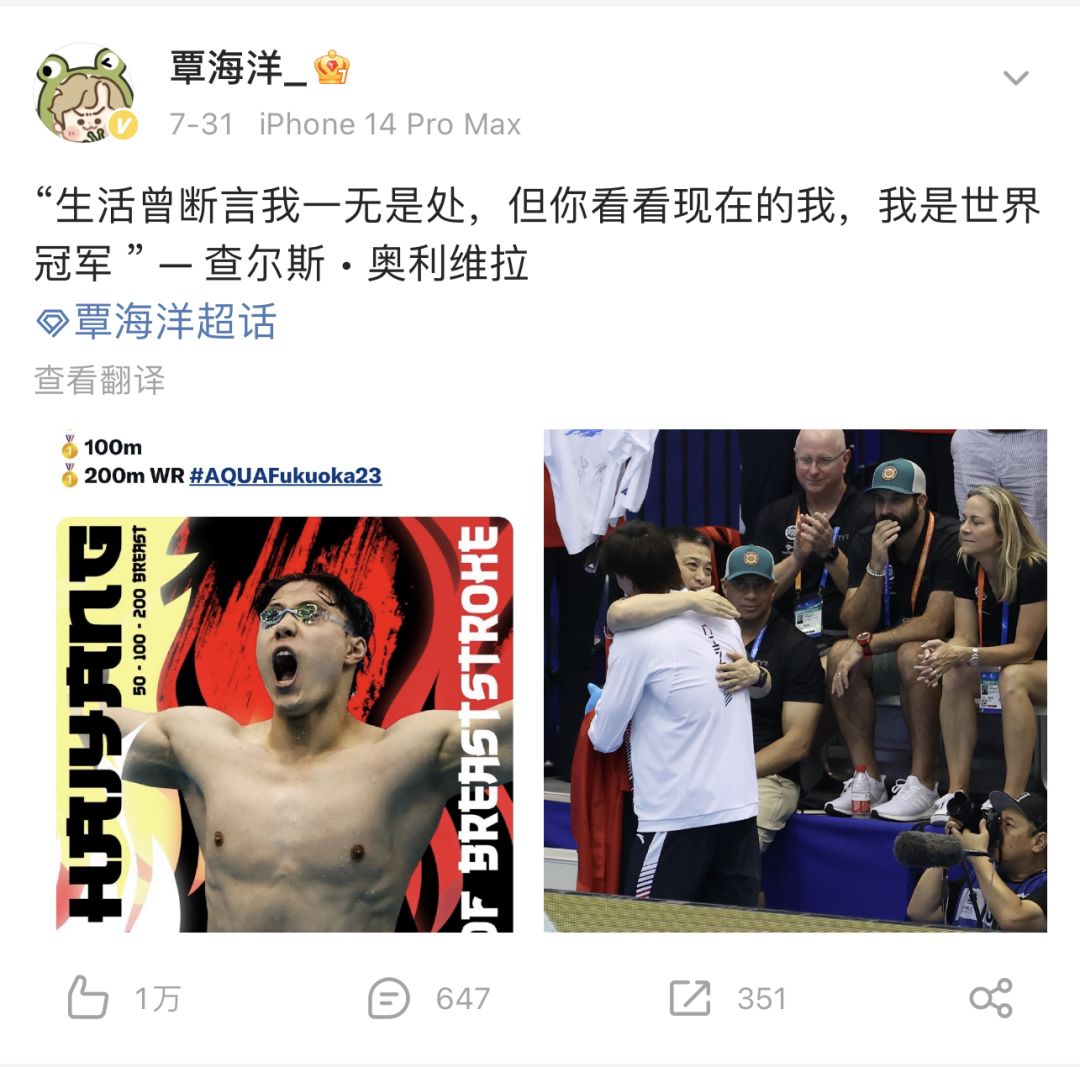 勇者们平时关注体育赛事吗?阿战上周末看到一条新闻:中国选手覃海洋在世锦赛上包揽了男子50米、100米和200米全部的蛙泳冠军,刷新了多项记录!历史上还从未有选手能在同一届世锦赛上包揽蛙泳三个项目的金牌,他是真正的世界蛙王!