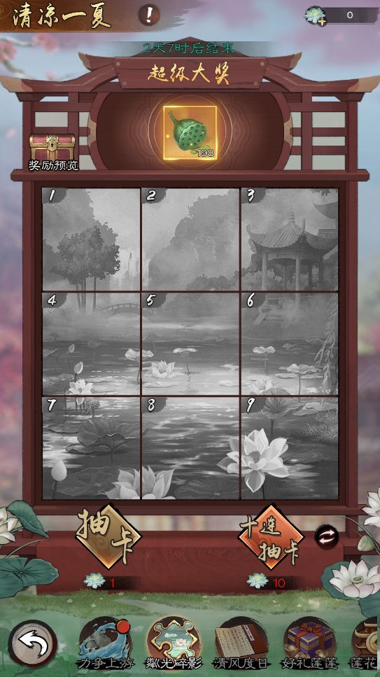 消耗玉蕊金莲,可随机获得道具材料、玉心莲子、拼图碎片奖励。集满9张不同拼图可以额外获得集卡大奖拼图可重复集凑。