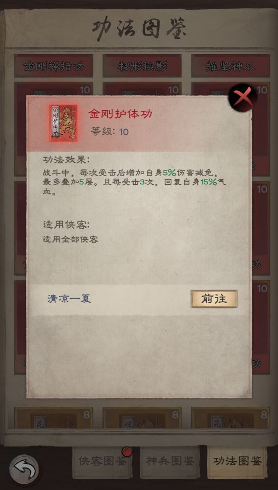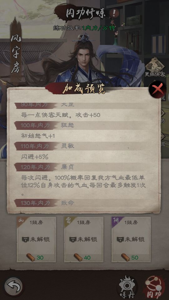 新增内力技能:角色内力等级达到60年、120年均会获得内力技能。不同侠客拥有不同的加成属性。
