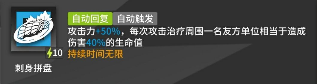 专三数据:攻击力+60%,每次攻击治疗周围一名友方单位相当于造成伤害的50%的生命值,持续时间无限,消耗技力8(可治疗到的范围是以自身为中心的九格)