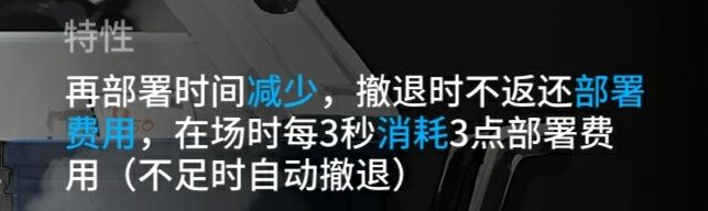 “每3秒消耗3点部署费用(不足时自动撤退)”你真当老子是便宜货啊(划掉),作为孑拥有如此低部署费用的同时还具有高面板的代价,便是这上场后就等于失去自动回费能力的负面效果,在一些费用比较吃紧的图孑注定无法先行部署。不过看到最初的饼时我本来以为是一秒一秒的扣费,结果实际是三秒三秒的扣,这就有了一点可操作的空间,比如部署孑后在他第二下普攻后撤回他就可以少吃点费用(只是举个例子,实际可能不太差这三点费用)为什么是普攻第二下?因为部署动画本身会占去一定时间,所以在孑A出第三下的时候费用早就扣掉了