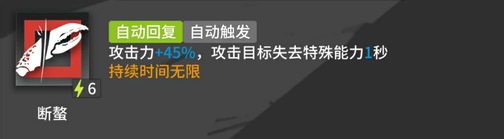 永续类技能,启动极快,输出也处于一个较为优秀的水平。由于攻速为1s所以沉默效果对单个敌人是全覆盖的,对于冰冻术士、萨卡兹术士这类敌人具有较好的针对效果