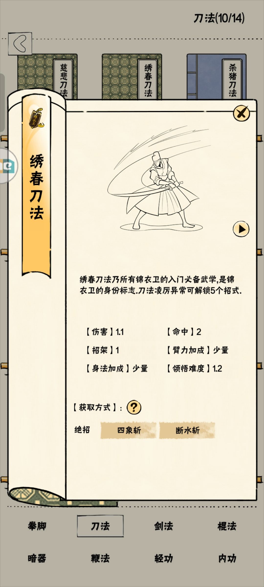绣春刀法的原型就是明朝特务机关锦衣卫、御林军概念性质的佩刀,绣春刀的样式和明代常见的腰刀相仿,刀身较一般腰刀短小,且有弧度。也就是和杀猪刀一个概念,根据刀而得名。