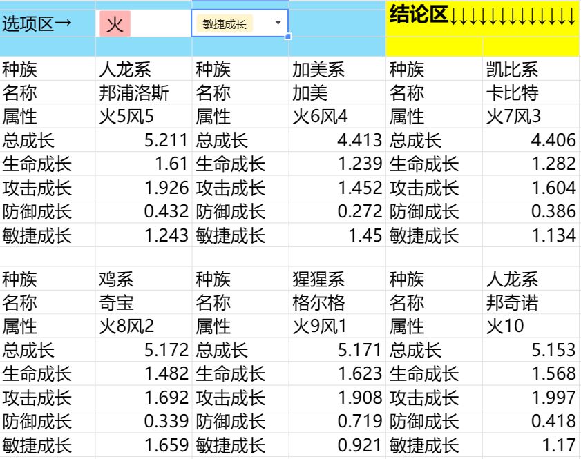 1.用法:在选项区选择你要查询的属性和需要查询的选项结论区会自动调取属性5以上具有所要查询的最高数值的宠物。1.1,手机用户可以双指按屏幕缩放到合适大小进行使用。2.考虑到强度和获取难度,查询没有将马年兽加入。因为现阶段,凡是获取了马年兽,应该没有会不培养吧。3.后续加入其他宠物后,数据库会相应更新。4.做表的时候是边打精灵王边做的,有BUG或者数据库资料输入错误可以告诉我进行修改,谢谢。5.还需要什么功能可以留言给我。