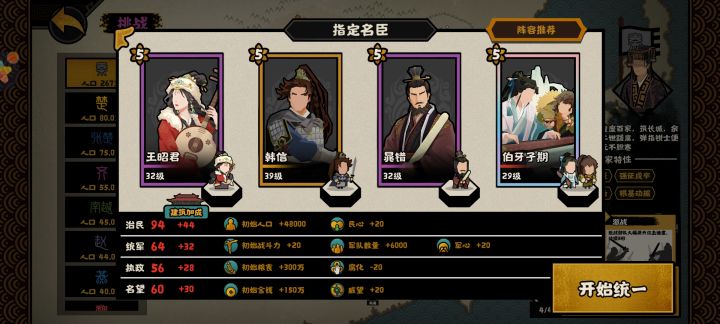 如果玩困难模式可以挂机,把王昭君换成范蠡更好,如果贤臣换成孔子,也就是把开局一百多战力换成民心威望士子,其他就更不推荐了。