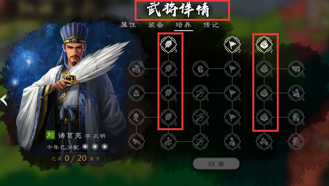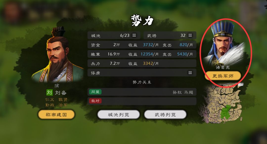 然后我们需要给关键的几个武将培养一下属性了比如【军师】(军师优先培养智和政)、【武力最高的那几个将领】