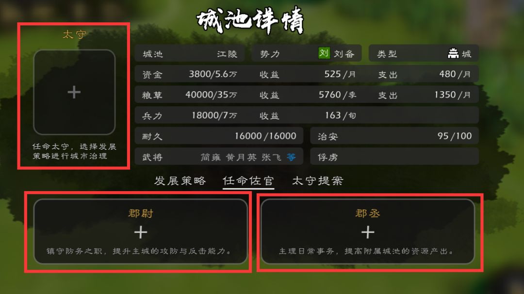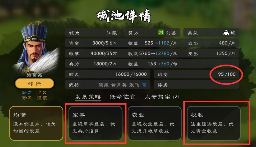 然后视我上面说的情况来决定太守侧重发展方向(或【税收】增加资金收益或【军事】增加兵力收益),但这得注意治安,越低你的兵钱粮收益会减少!