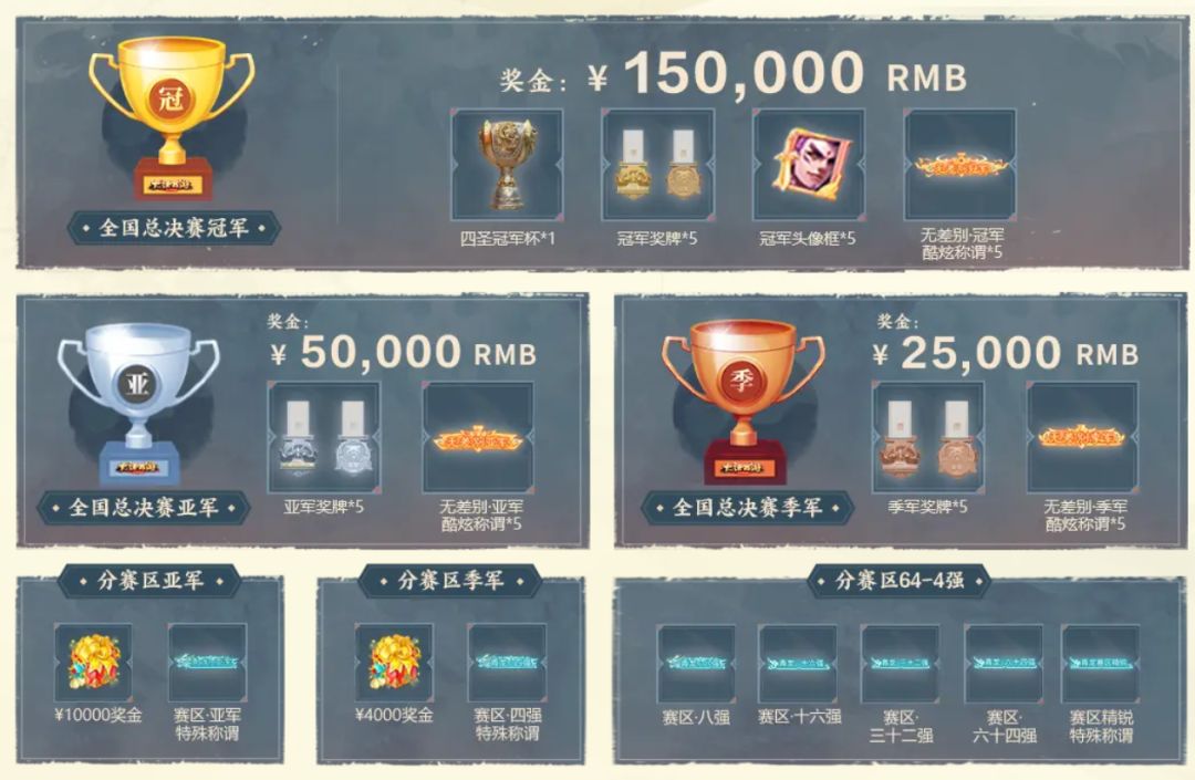 四强将保底获得“分赛区季军”(四强赛两支败者队并列)与全队4000元(税前)奖金!至于更高的荣誉和奖金,就需要各位选手拼搏争取了!