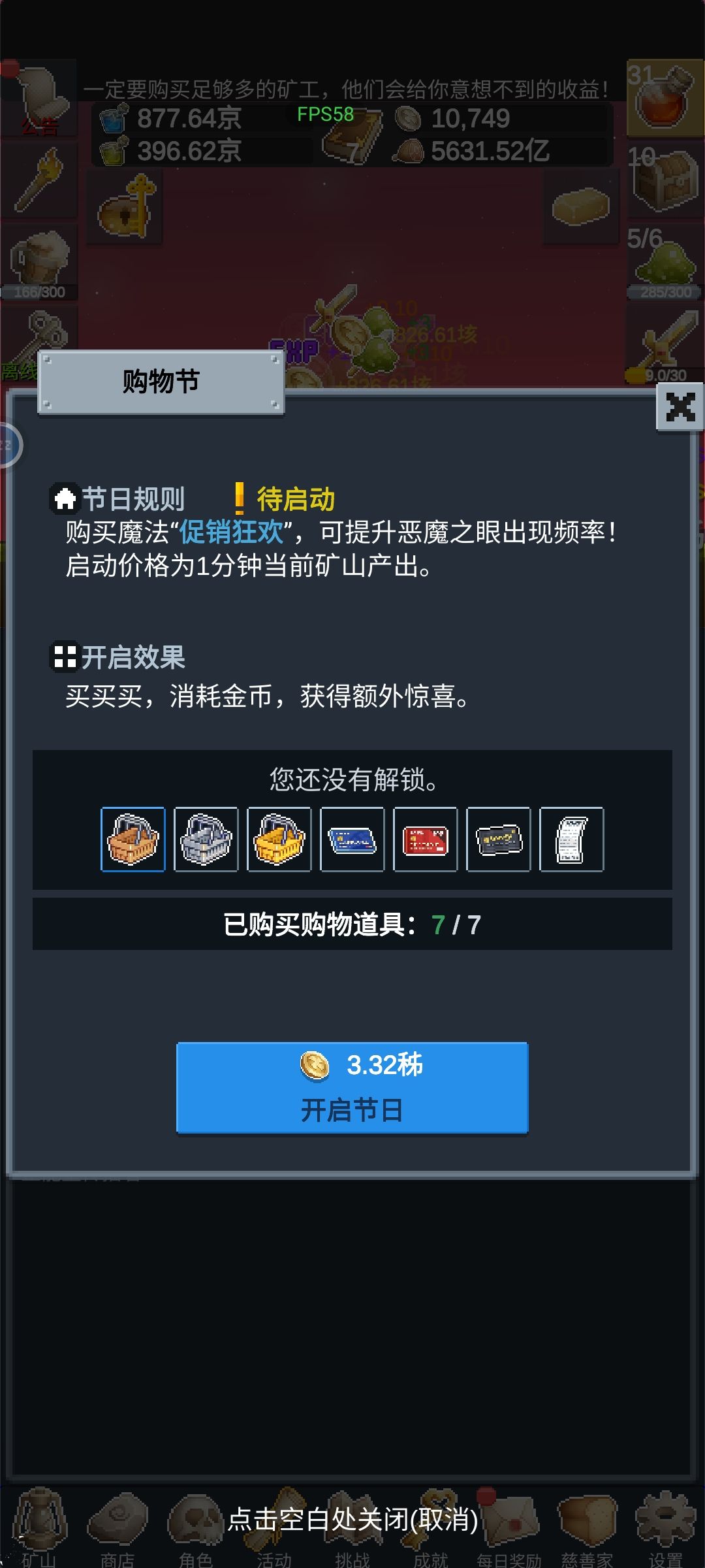 购物节:解锁奖励条件是开启节日后,花费金币。既会在商店会看到奖励,金币购买即可达成解锁。当前收益 500垓/秒 会解锁全部7个奖励。全部解锁后共增加矿山收益14% 。