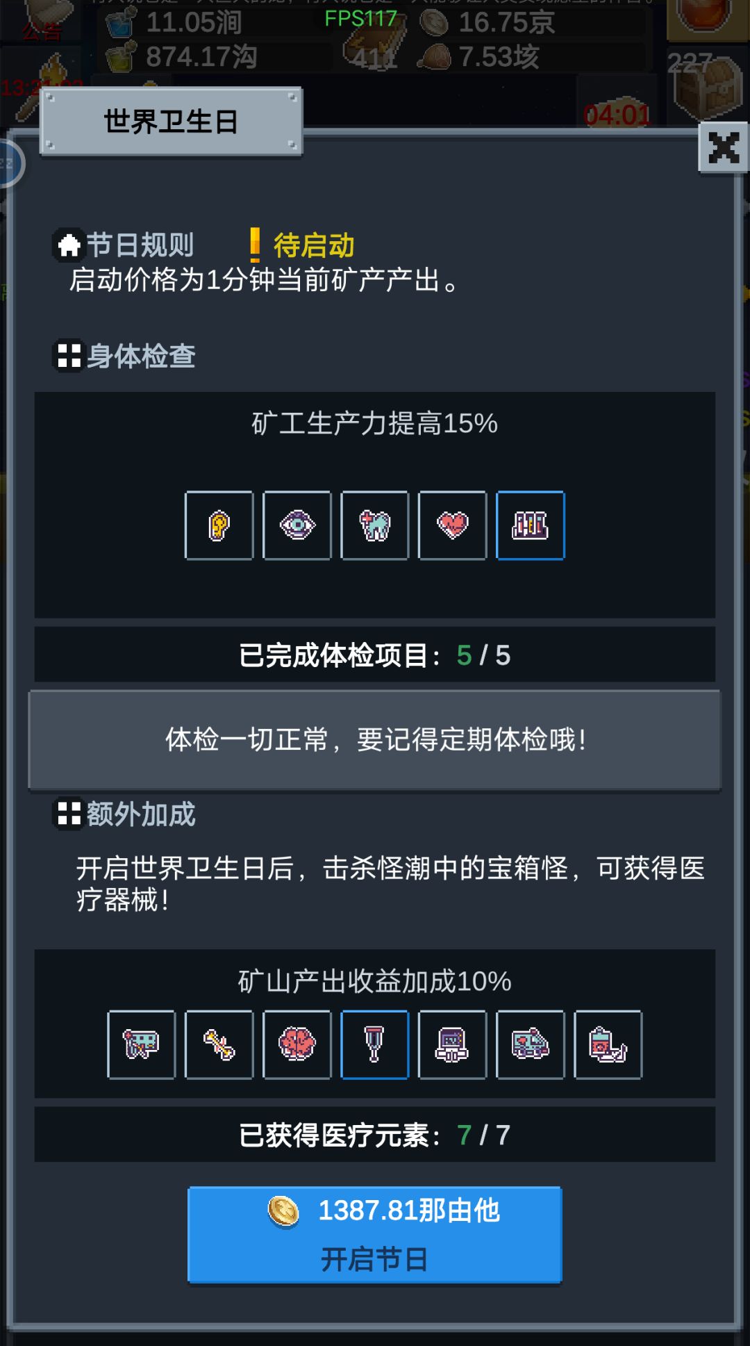 卫生日:解锁奖励条件是开启节日后,开启并击杀宝箱怪后,有一定几率获得奖励,奖励出现在商店后,购买解锁。奖励全部解锁后矿工产出+50%,矿山产出+70% 。