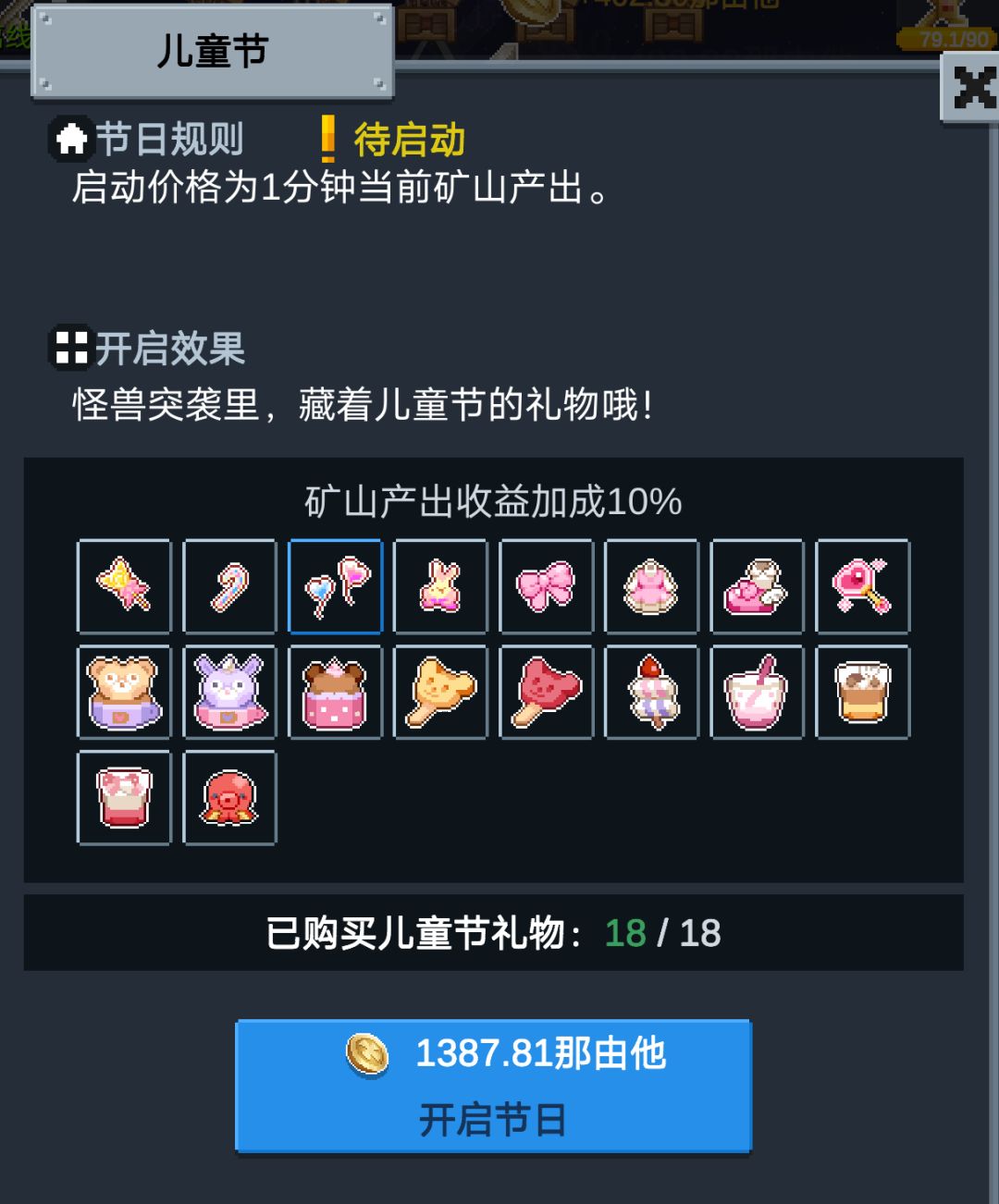 儿童节:解锁奖励条件是开启节日后,点击怪兽突袭,有一定概率会获得奖励,奖励出现在商店后,购买即可解锁。奖励全部解锁后矿山产出+180% 。