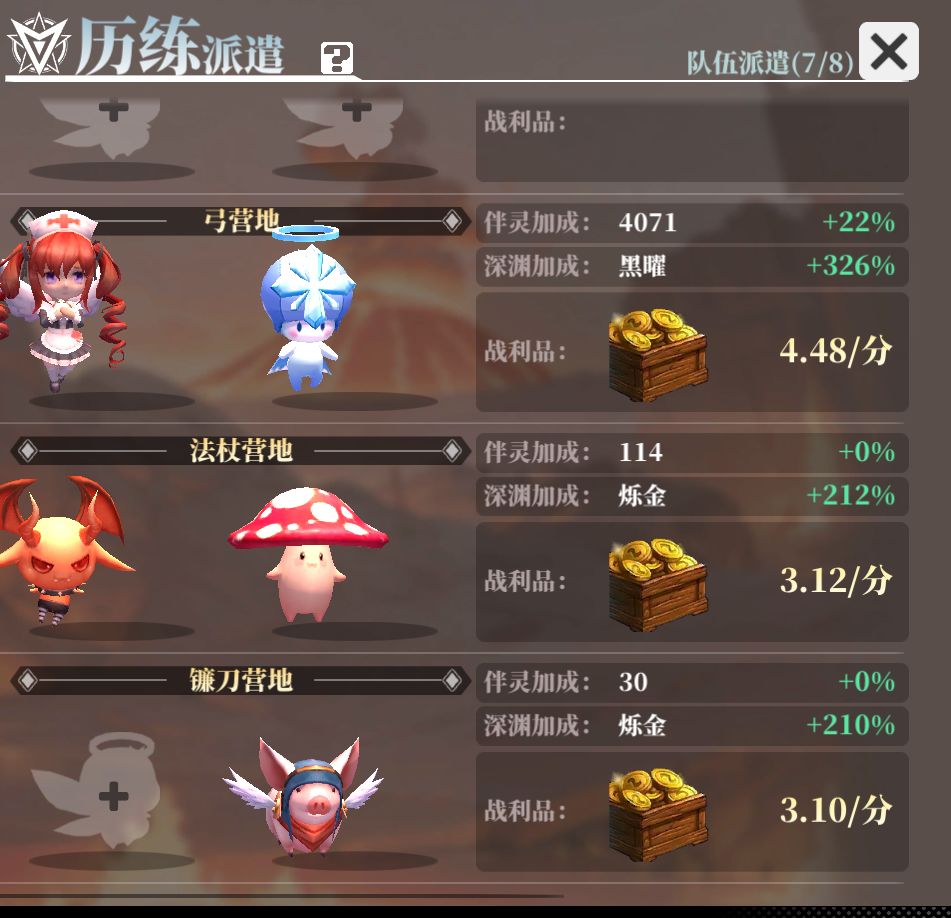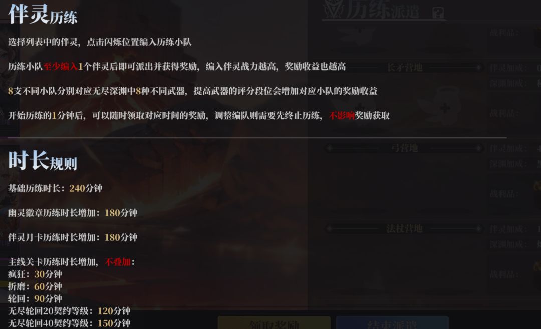 伴灵历练每个阵营会有相应的等级,青铜,秘银,烁金,黑曜。等级根据对应的武器装备评分(不含强化评分),所以首先要有一把评分底子高的武器,然后再通过升级词条,最高可以达到黑曜(穿上武器打一次无尽深渊,不是契约,不是契约,不是契约)。所以优先把SSR,高等级高星级的伴灵派遣到黑曜,理论上获得的奖励会更多。