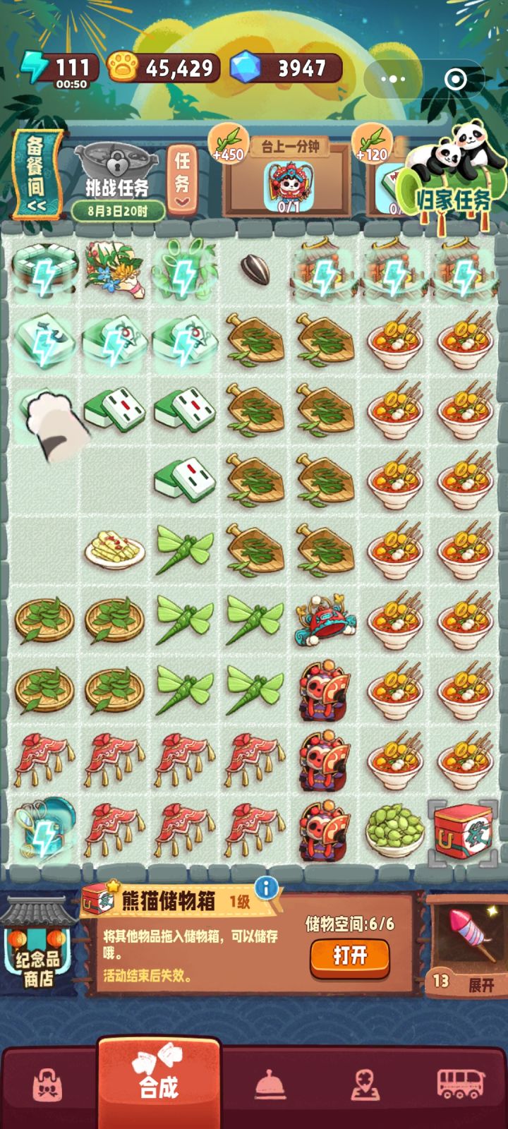 只要竹笋,所以簸箕直接卖,戏台直接卖,东风直接卖,一个钵钵鸡大概需要160点体力,15个就是大约2400点体力,其他的二三百点体力足够了。