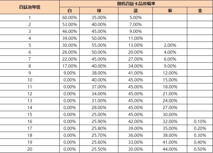 现将「百妖谱」中百妖池各等级抽取百妖卡概率进行公布,细则如下: