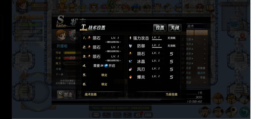 然后再转职为法师,在战术设置里将法师技能设置上去,并传送到妖精平原开始挂机。
