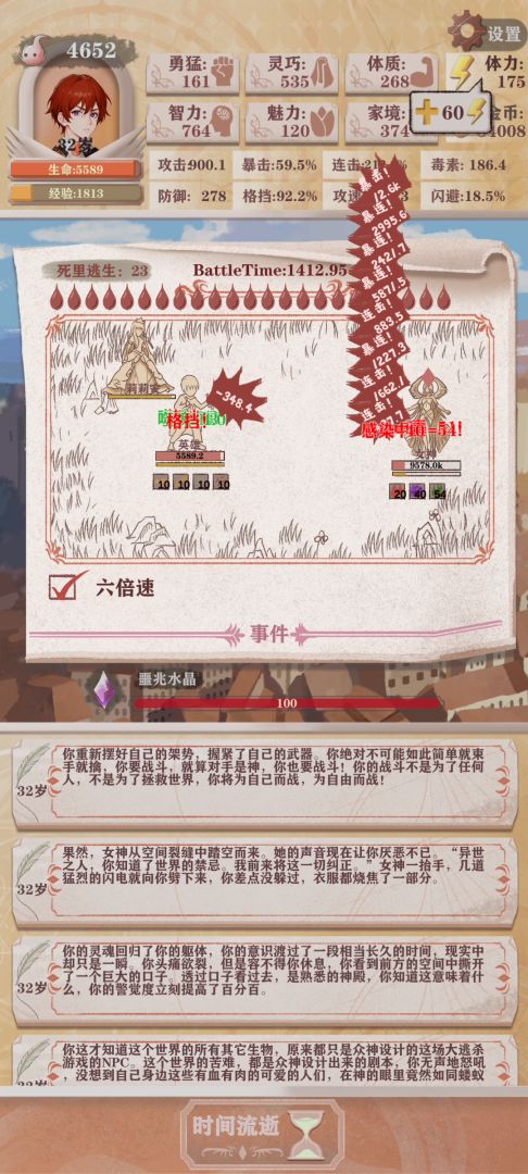 这是这是贴主在摸索这个打法时通关女神的珍贵影像,由于只有残酷1,只能锁定一个天赋,贴主的天赋roll只到了资本家和科学家,并且贴主当时并没有意识到松露的超高收益,从始至终没有摘过松露,在小细节上也频频出现问题,比如忘记喂食蜜汁生物导致女仆拉布消失。。。。(这个问题明明很大吧!)贴主当时并没有提前调整光环。且残酷1仅能享受到5%的属性加成,而这远远未及该打法的残酷等级上限。即便在这种情况下,这个玩法依然是能初见击杀女神的。最重要的是,贴主当时的主角光环只有10万灵魂左右,可见该玩法门槛之低,上限之高。