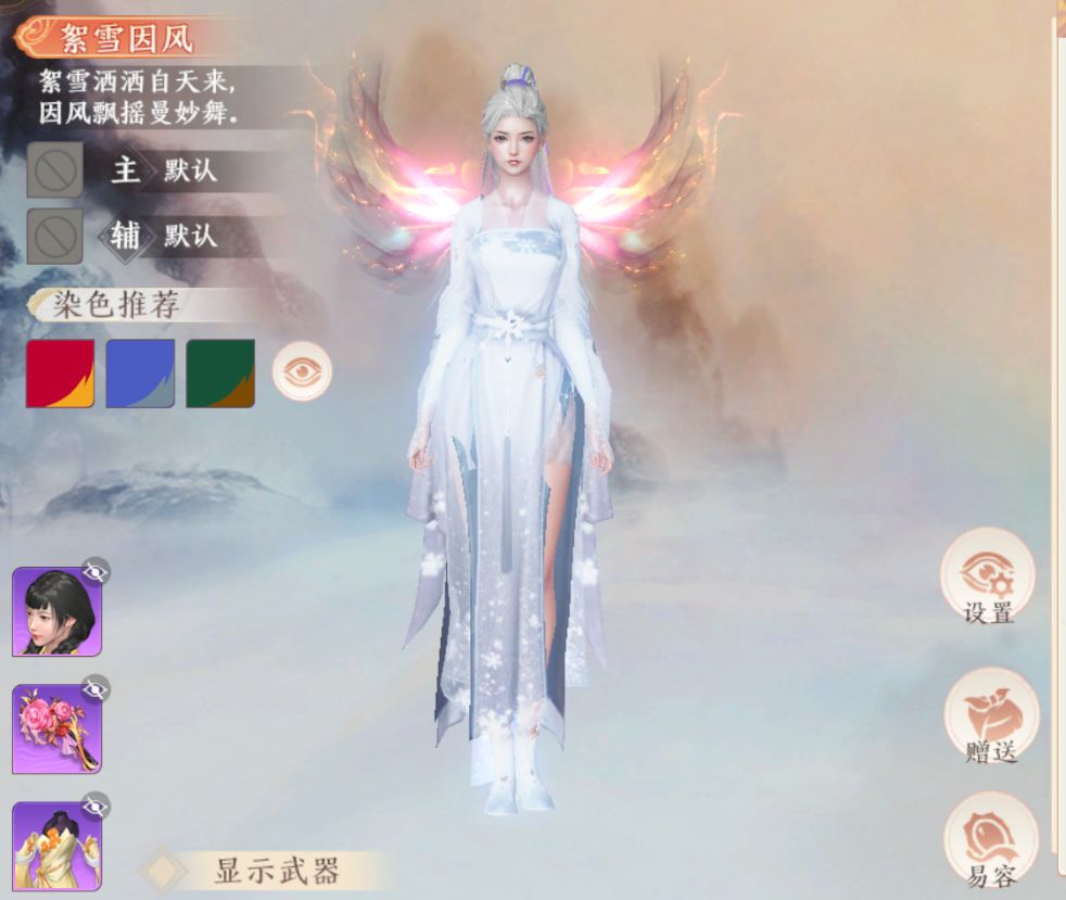 在回到絮雪因风这套时装本身来看,不需要你有“缟白”染色,它本身就自带全身亮白的配色,对于我这种脸黑又喜欢全身雪白的人来说,真是在合适不过啦!