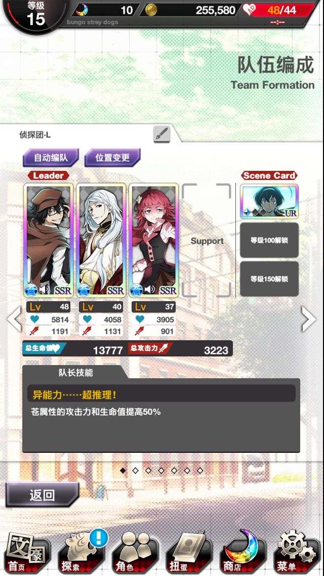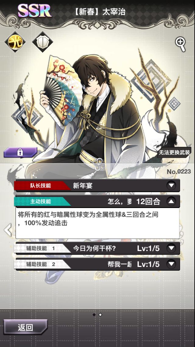 太宰的技能比露西的感觉要好很多,而且露西的生命与攻击力也比较平庸。但是新春太宰是光属性,无法享受队长的50%的加成,所以我又犹豫了。