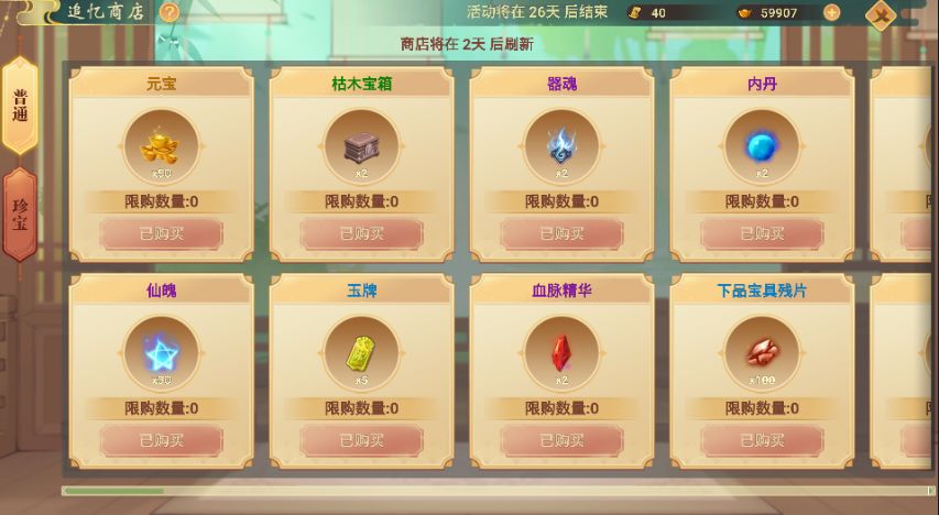 其中普通商店铜钱购买,肯定是全部买掉,3天刷新一次,别忘记了