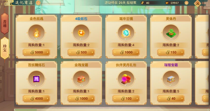珍宝商店需要充值回馈的券才能买,氪金度不同,能买的东西不同,其中灵丹性价比最高,必须拿下。仙宝其次,然后是金色妖魂,其他就看自己喜欢吧,我是建议按炼妖石、妖石、金箱子优先的方式购买