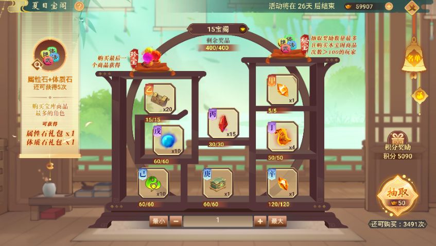 4、如果想抽更高积分,且有足够小号的仙友可以重复2的操作,属性+体质以及灵丹都可以获取10次。继续操作可以获得天地玉牌,也都是不错的奖励。即使不想抽更高积分,只要有足够的小号元宝支持,也可以让小号抽399次,大号去抽最后一次,可以获得很多资源,就是有点废小号元宝。
