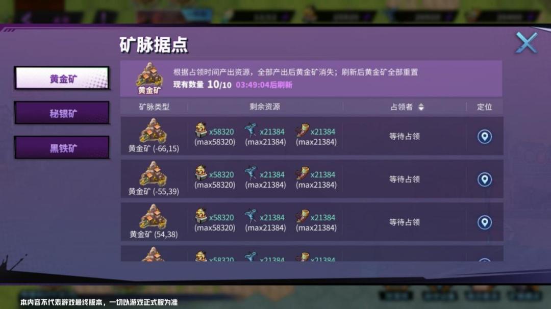 地图上存在着黄金矿、秘银矿以及黑铁矿三种矿脉。占领黄金矿、秘银矿后,镇魂将可获得稀有资源;黑铁矿则设有重重关卡,镇魂将们可通过作战表现获得奖励。
